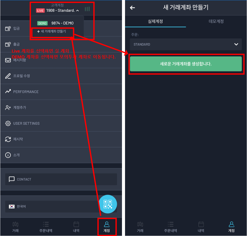 - 계정 메뉴에서 상단 계좌를 클릭하면 Live 계좌와 Demo 계좌 간 전환이 가능합니다.