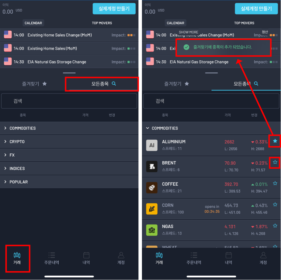 - 모의계좌 전환 후 하단 '거래' 메뉴에서 '모든 종목'을 선택합니다.